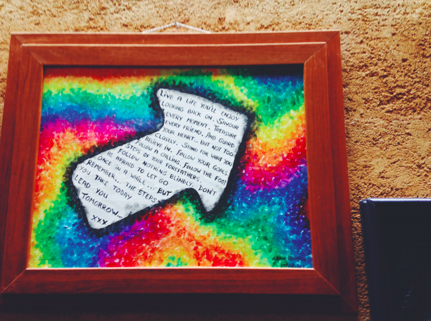This picture was from the top of Cruz de Ferro. Cruz de Ferro is an iron cross placed at the top of the highest point on the Camino. It’s a really tall cross on top of a pile of rocks that pilgrims leave. The tradition is that you carry a rock with you symbolizing all that weighs heavy on you, your regrets, sins, guilt, trauma, pain, loss, grief… you name it, you leave it. This was my view looking down at all the rocks everyone had left. The writing on the street reads, “Don’t be afraid.” I had to sort of distort the colors of the picture to really see the coloring of the writing.